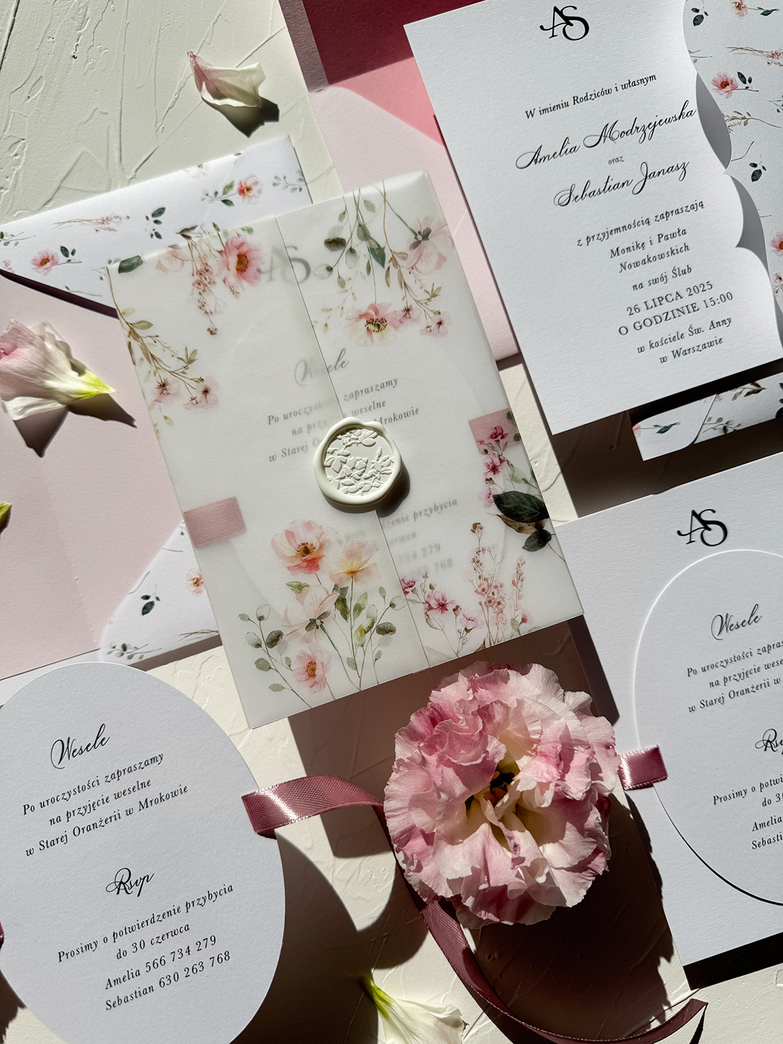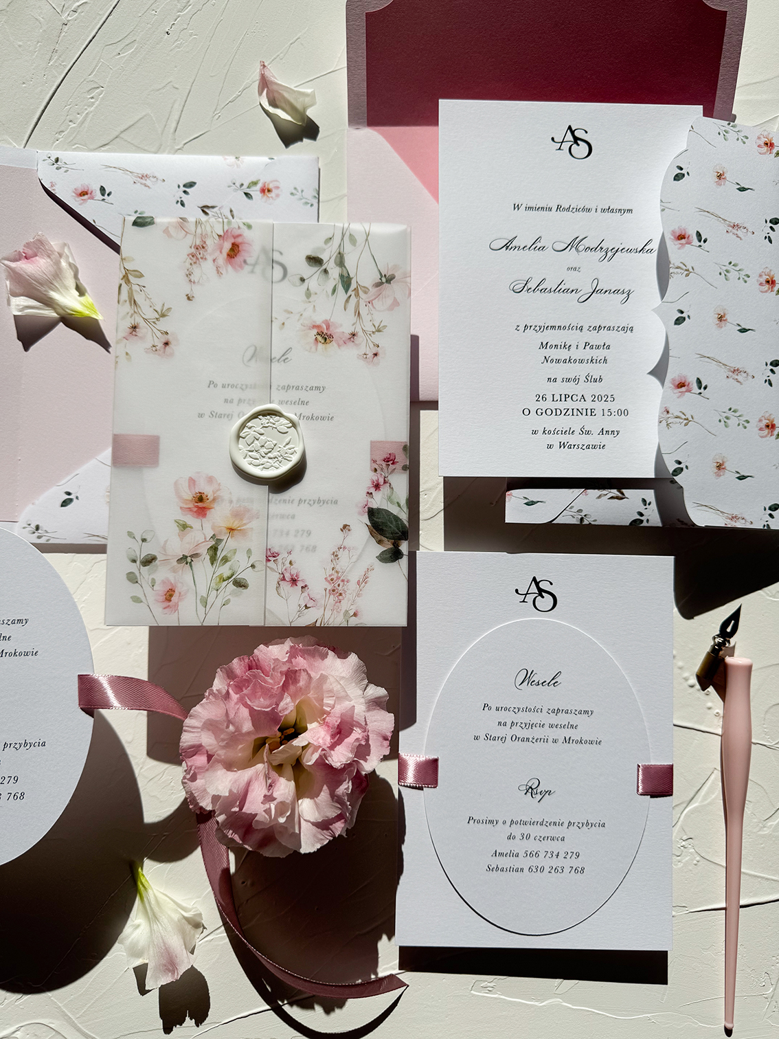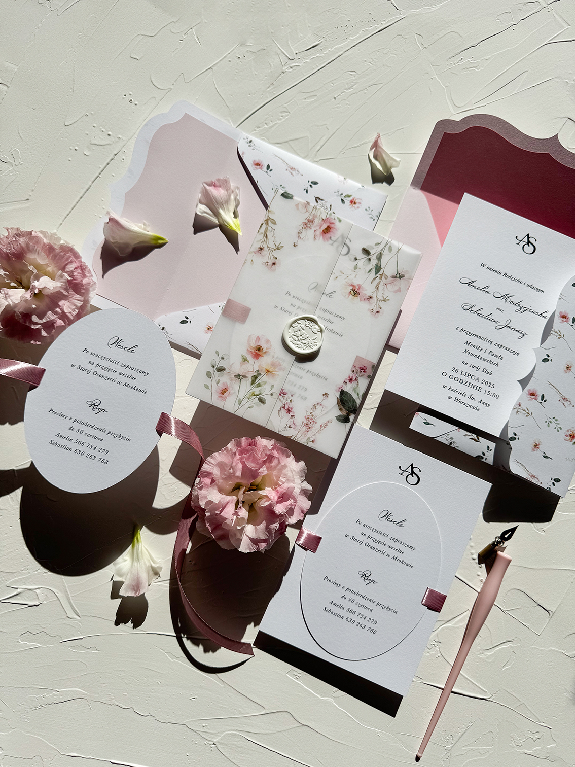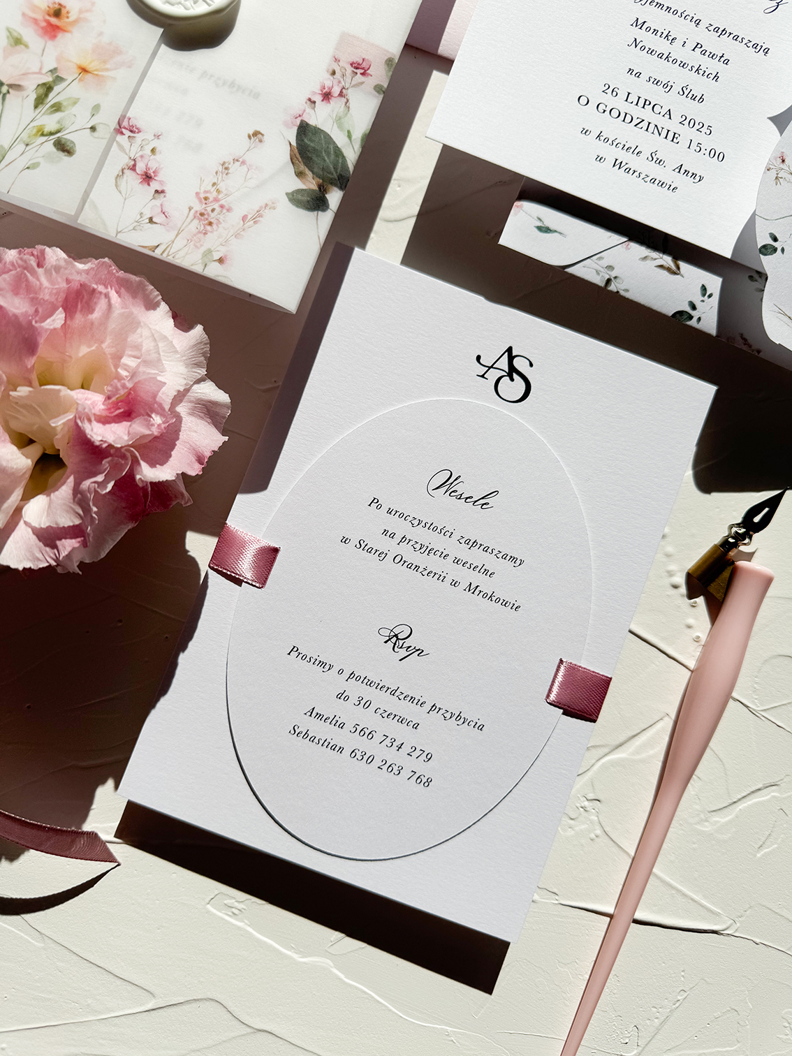 Personalizacja gości na karcie głównej jest wliczona w cenę. W wersji podstawowej dołączana jest zwykła koperta, a karta informacyjna nie zawiera nacięć oraz wstążki.